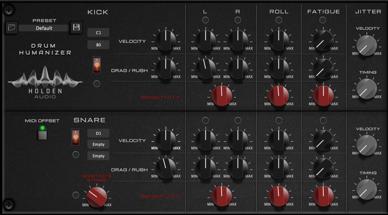 - Per-drum control for Kick, Snare, Toms, and Cymbals, each with their own humanization and bypass options